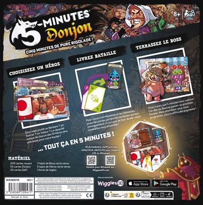 Unissez vos forces pour venir à bout des pièges mortels et des monstres dangereux qui peuplent les Donjons ! Chaque joueur incarne un héros parmi les dix proposés, qui possèdent leurs propres cartes et capacités spéciales. Il n’y a pas de tour de jeu dans 5 Minutes : Donjon. C’est une course contre la montre où tout le monde tente de jouer des symboles qui correspondent à la carte actuelle du Donjon. Vous êtes tous dans le même bateau et votre équipe n’a que deux options : triompher du Boss et passer au niveau suivant… ou périr en essayant !