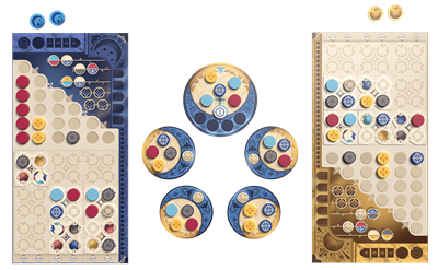 Choisissez toutes les tuiles d’une même couleur depuis un cercle de fabrique de jour, ou depuis l’ensemble des fabriques côté nuit ! Posez un motif Dôme pour qu’il corresponde à vos lignes de plafond, afin de marquer le plus de points possible. Remplissez les objectifs pour faire la différence.