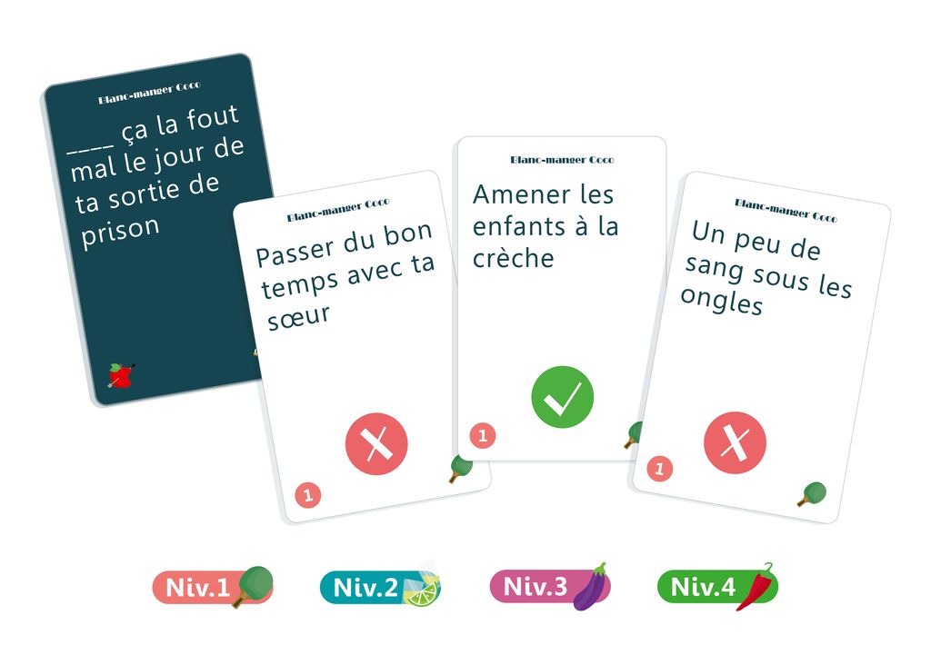 Plaisir à 2 apporte une expérience nouvelle à la gamme Blanc-manger Coco à double titre. Tout d’abord on joue en coopératif : le but est de battre la pioche. A chaque niveau franchi, on débloque des nouvelles cartes plus pimentées qui sont incorporées dans la pioche et on accroît le niveau de difficulté : la pioche joue de plus en plus de cartes par manche alors que les joueurs n’ont le droit qu’à une seule carte par manche. Ensuite et enfin, le jeu se joue à 2 ce qui n’était pas possible sur les autres jeux de la gamme. A tour de rôle, les joueurs vont se muer en Question Master et essayer de retrouver la carte de leur partenaire parmi les cartes jouées. Et comme sur le jeux originales, la stratégie gagnante n’est pas toujours la même : parfois jouer au plus absurde, parfois au plus trash… et parfois au plus évident.