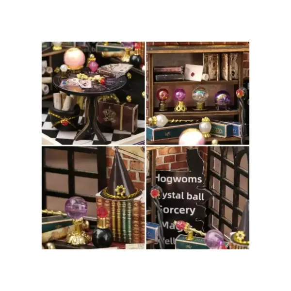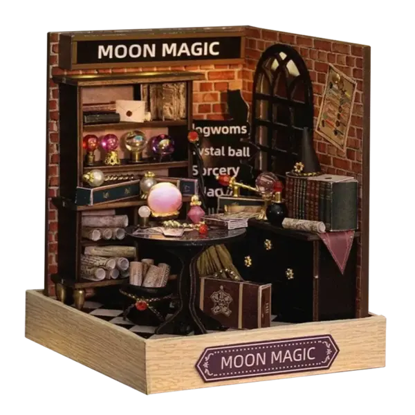 Entrez dans un cabinet d’une voyante, où trône une petite table ronde. Au centre, une boule de cristal scintille, entourée de cartes de tarot. Des étagères remplies de grimoires anciens et de talismans ajoutent une touche de mystère.