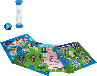 Observez une carte présentant un lieu, sa situation géographique, ses particularités… Après 10 secondes d’observation, répondez aux questions au dos de la carte. Un jeu de mémoire et connaissances pouvant se jouer seul.