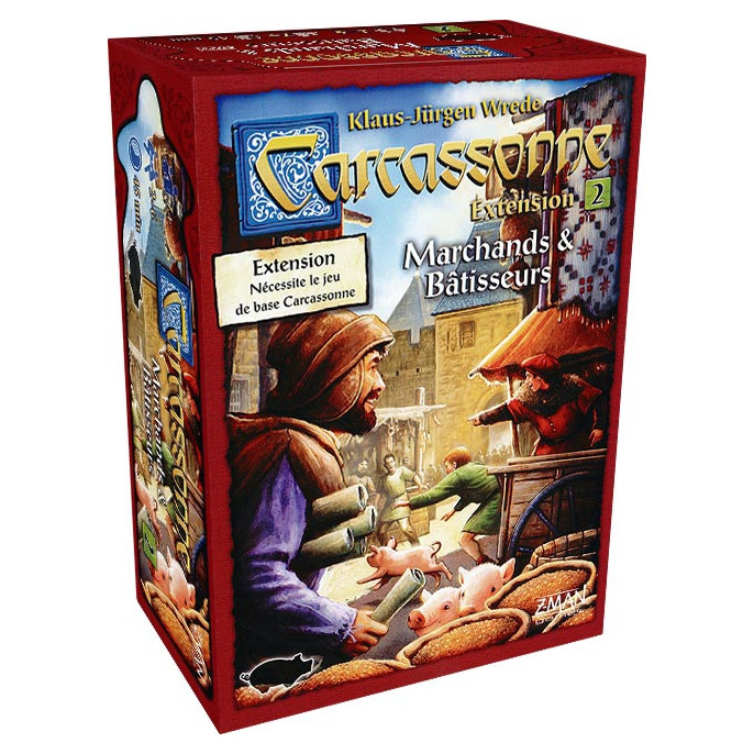 Avec l’extension Marchands & Bâtisseurs, de nouveaux objectifs s’invitent à la table. Collectez des marchandises précieuses, accélérez vos constructions et optimisez votre présence dans les prés pour marquer toujours plus de points. Compléter les villes vous rapportent des marchandises : amassez-en le plus du même type pour marquer des points bonus en fin de partie. Le bâtisseur vous permettra d’accélérer la construction de vos routes et de vos villes en jouant 2 tours de suite. Quant aux cochons, ils s’attachent à vos paysans dans les prés. À chaque ville avec blason complétée, vous marquez 3 points par ville adjacente au pré occupé par votre cochon.