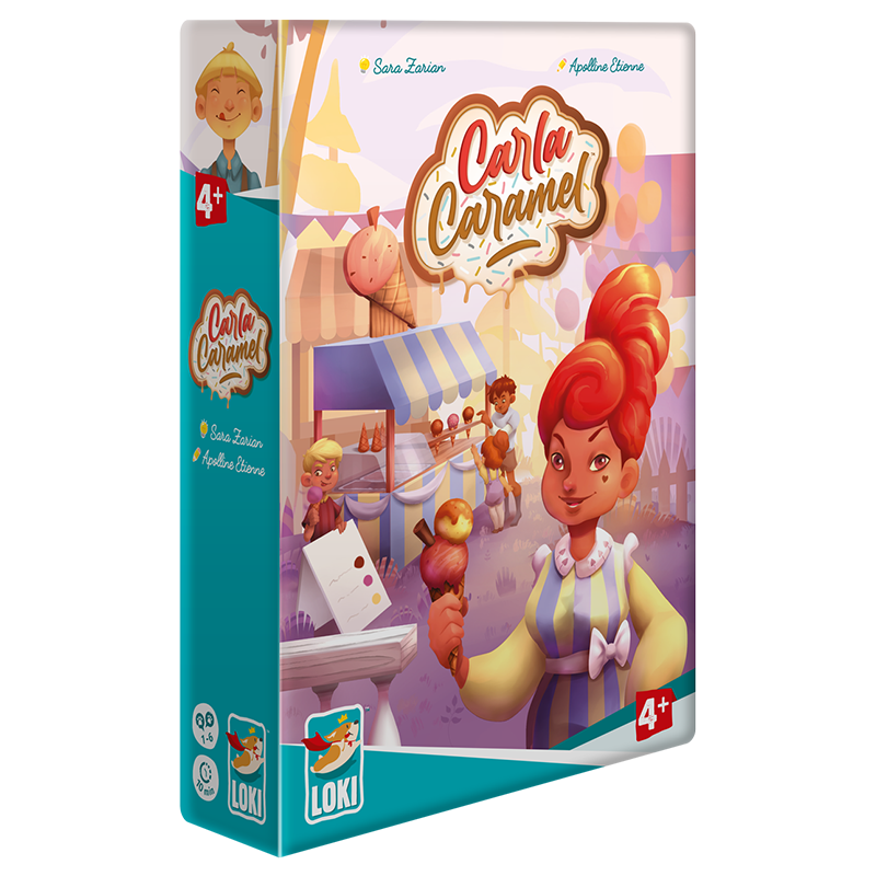 Carla Caramel est un jeu coopératif où il faudra aider la marchande de glaces à satisfaire les enfants qui font la queue devant son stand. Pour cela, distribuez 1 cornet de glace à chacun d’eux ! Mais attention à ce que le Soleil ne fasse pas fondre vos précieuses créations