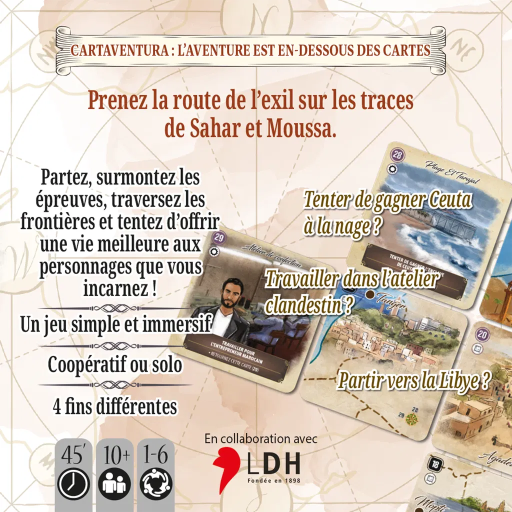De nos jours, Kaboul. Vous êtes Sahar, une étudiante Afghane de 21 ans. À l’arrivée des Talibans au pouvoir en août 2021, votre droit d’étudier a été remis en cause. Vous voulez rejoindre votre fiancé en France, mais votre demande de visa est refusée. Désespérée, vous choisissez de fuir votre pays. Au même moment, à Mopti. Vous êtes Moussa, jeune Malien de 15 ans, fils de pêcheurs. Votre rêve est de trouver un emploi dans un grand restaurant. Vous êtes particulièrement attiré par la France, on dit tellement de bien de la gastronomie de ce pays. Vous êtes prêt à travailler dur pour réaliser votre rêve et aider votre famille. Vos parents n’en savent rien, mais demain, vous partez pour l’Europe !
