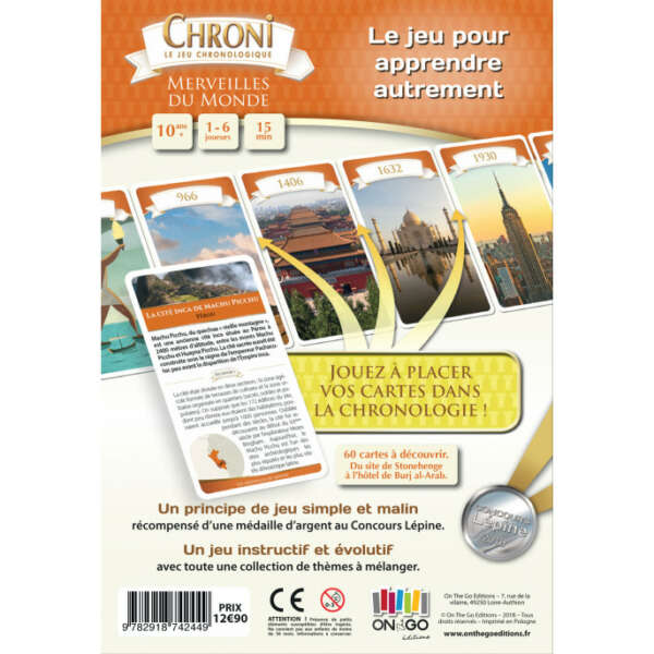 Du site mégalithique de Stonehenge (vers -2800) à l’hôtel de Burj al-Arab (1994), retrouvez dans ce titre une sélection de 60 monuments du monde à découvrir dans toute leur diversité. Un principe de jeu simple et malin récompensé d’une médaille d’argent au Concours Lépine. Un jeu instructif et évolutif avec toute une collection de thèmes à mélanger.