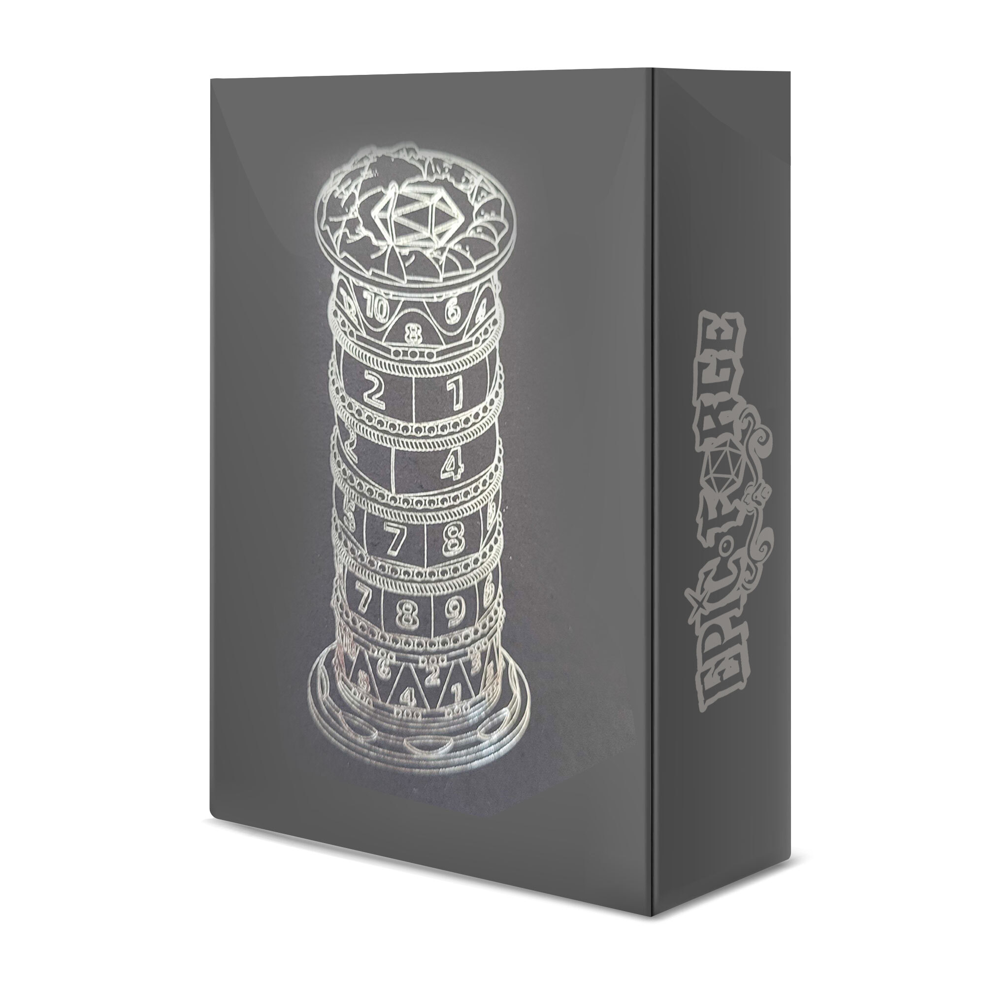 La tour intègre un set complet de dés RPG : D4, D6, D8, D10, D12, D20 et D100. Tous les dés sont déjà en place à l’intérieur du cylindre rotatif, prêts à l’usage pour une large variété de jeux de table.