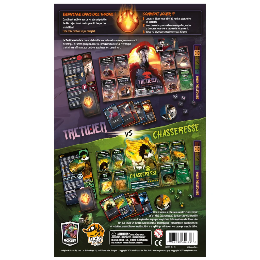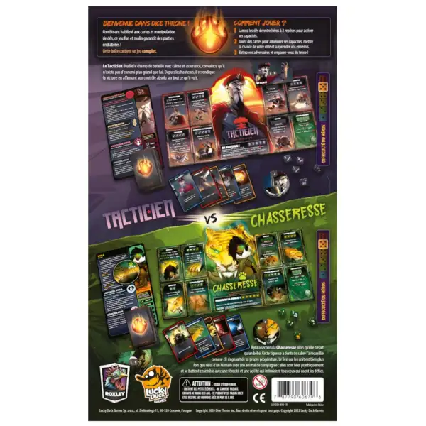 Dice Throne est un jeu compétitif ou en équipe, proposant des combats à base de dés et de pouvoirs spécifiques à chaque personnage. Dans cette première boite vous incarnerez le Barbare ou l’Elfe Lunaire dans un combat épique !