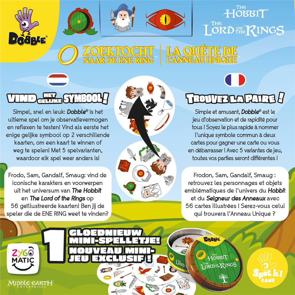Tous les éléments et personnages emblématiques de l’oeuvre de J.R.R Tolkien (repris dans les films) sont présents dans ce jeu d’observation où s’affrontent petits et grands. Soyez encore plus observateur que l’Oeil de Sauron pour repérer les Hobbits et leurs compagnons sur les cartes rondes. Laissez ensuite votre rapidité et vos réflexes vous mener jusqu’à la Victoire !
