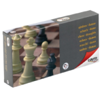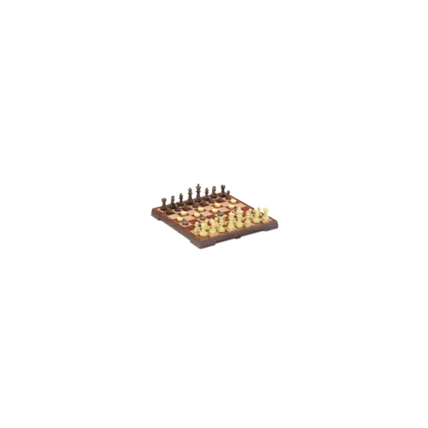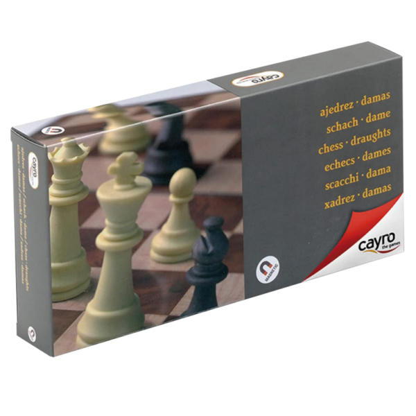 Un échiquier de 24 x 24 x 2 centimètres avec des pièces d’échecs et de dames magnétiques. Parfait pour des parties pendant des voyages ou autres déplacements !
