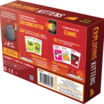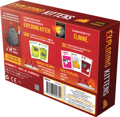 Exploding Kittens revisite la célèbre Roulette Russe dans un jeu de cartes où les chatons côtoient d’un peu trop près grenades, missiles nucléaires et torpilles dans un cocktail détonant ! À tour de rôle, les joueurs piochent des cartes du paquet jusqu’à ce qu’un joueur révèle un chaton explosif, provoquant sa mort et sa défaite pour la partie en cours. Les autres cartes permettent aux joueurs de se protéger des déflagrations, de forcer les autres à piocher plus ou à regarder les prochaines cartes avant de remélanger le tout. Le joueur qui a réussi à éviter toutes les explosions remporte la partie !