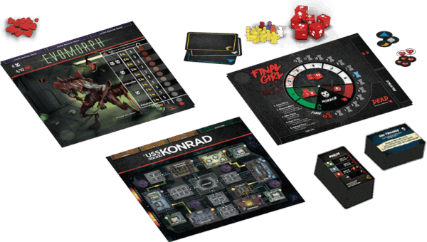 Le jeu de la vie et de la mort peut même se dérouler dans le vide intersidéral. L’Évomorph se transformera au fil de la partie et peut disparaître pour revenir au moment où vous vous y attendez le moins… ou serez-vous assez malin pour le faire tomber dans votre propre embuscade ? L’USS Konrad introduit des cartes d’accès pour accéder à différentes parties du vaisseau.