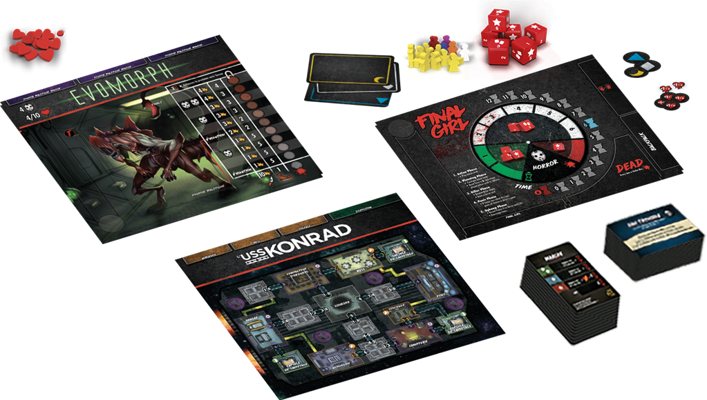 Le jeu de la vie et de la mort peut même se dérouler dans le vide intersidéral. L’Évomorph se transformera au fil de la partie et peut disparaître pour revenir au moment où vous vous y attendez le moins… ou serez-vous assez malin pour le faire tomber dans votre propre embuscade ? L’USS Konrad introduit des cartes d’accès pour accéder à différentes parties du vaisseau.