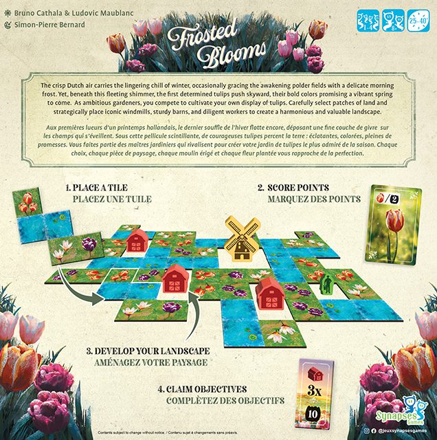 À chaque tour, ils sélectionnent une tuile Paysage pour l’ajouter à leur propre jardin, puis jouent une carte de leur main afin de marquer des points selon les groupes de motifs obtenus. Les espaces clos accueillent des Ouvriers, Granges ou Moulins qui offrent d’importants bonus de fin de partie. De plus, en regroupant certains éléments et en remplissant leur jardin, les joueurs peuvent valider des objectifs. Celui ou celle qui termine avec le score le plus élevé remporte la partie !