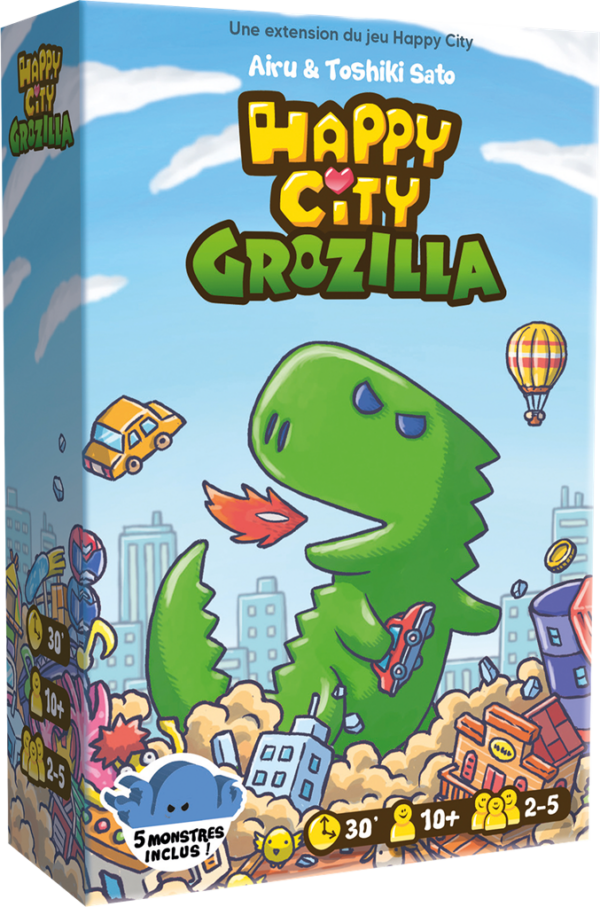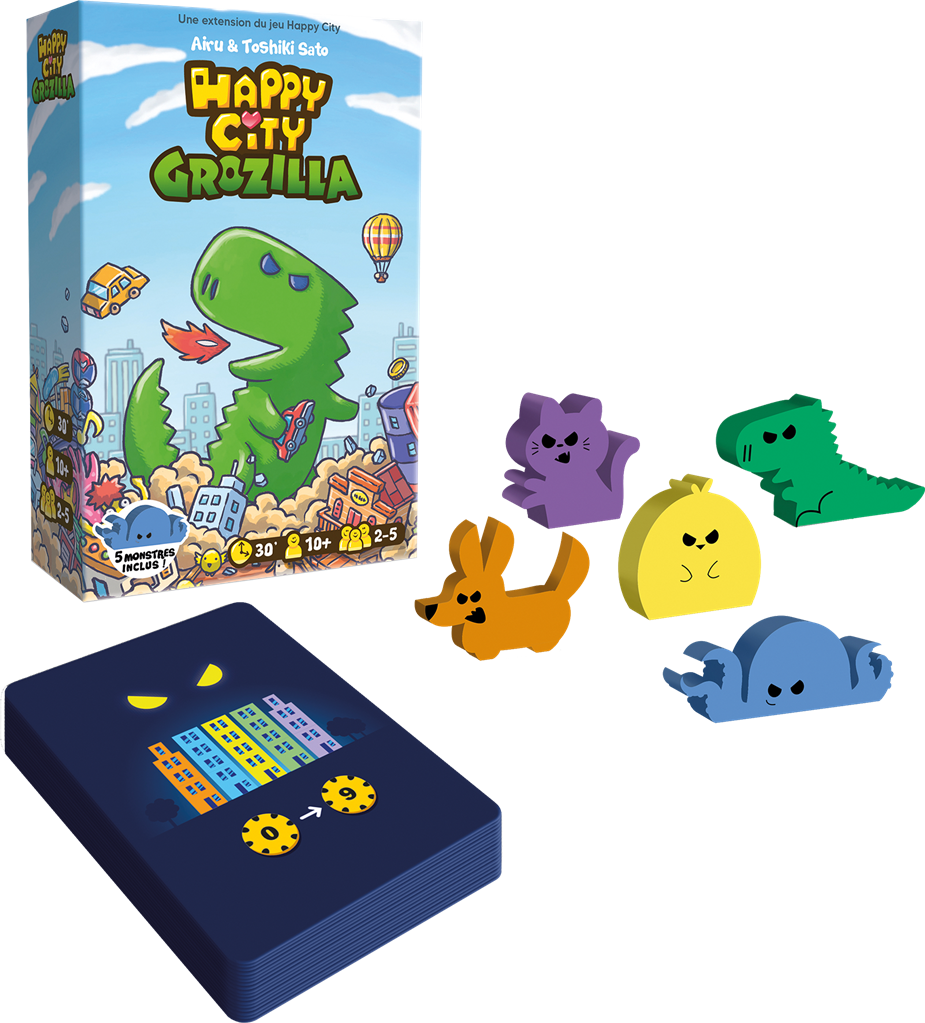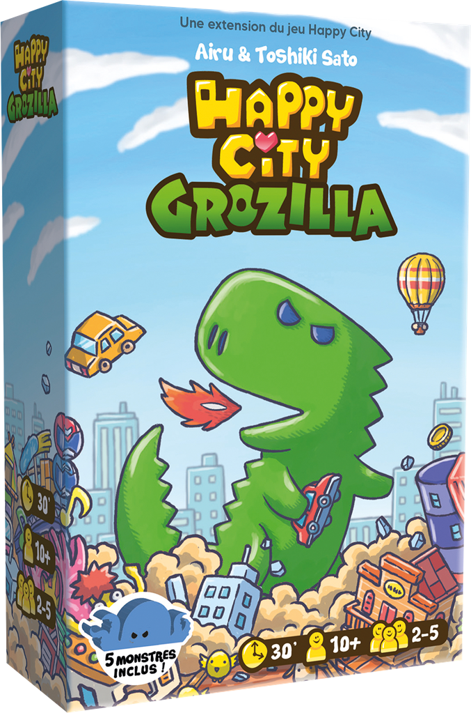 Happy City Grozilla est une extension monstrueuse et folle pour Happy City, destinée aux deux modes de jeu, famille et expert. Désormais, des monstres géants se cachent dans une nouvelle pioche, parmi de superbes bâtiments multicolores que vous voudrez forcément avoir dans votre ville, pour rendre encore plus heureux vos habitants. Mais attention, si un monstre arrive chez vous, dépêchez-vous de le refiler à votre voisin avant qu’il ne s’installe définitivement !