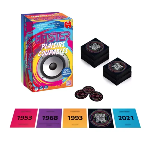 Dans Hitster – Plaisirs Coupables, les joueurs créent leur propre frise chronologique musicale sans la moindre gêne. Après tout, tout le monde a ses petits plaisirs coupables, non ? Le premier à réunir 10 hits devient le grand HITSTER !