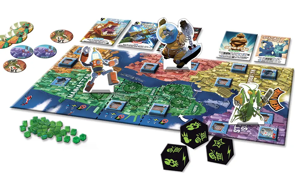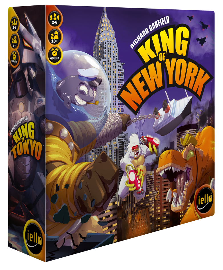 King of New York reprend les principes de base de King of Tokyo tout en y ajoutant de nombreuses nouveautés. Lancez les dés, usez de tactique et faites la bonne combinaison. Piétiner tous les quartiers de la ville et détruire des immeubles vous fera gagner des points. Mais attention aux unités militaires qui font feu sur vous à chaque face « OUCH » lancée. Attirez sur vous le feu des projecteurs et emportez le titre de Superstar. Ou devenez le défenseur de la ville aux cotés de Lady Liberty.