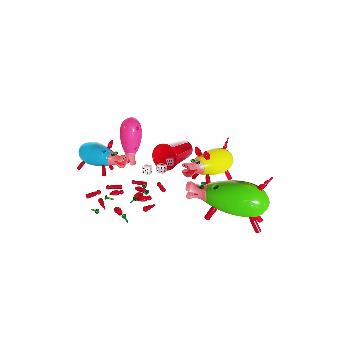 La construction du cochon qui rit se fait pièce par pièce (membre par membre !). Les dés affichant 6 donnent le droit au joueur de commencer à assembler son cochon, les as lui permettent de placer les » attributs » : pattes, oreilles, yeux…