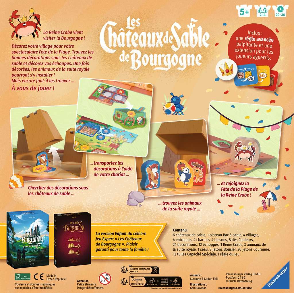 C’est la grande fête annuelle et vous devez préparer la venue de la reine Crabe ! Elle vient passer ses vacances dans votre région : les Châteaux de sable de Bourgogne ! En tant que marchands influents, décorez au mieux votre échoppe pour impressionner la reine. Collectez les bonnes marchandises et stockez-les dans votre entrepôt. Utilisez votre charrette pour les ramener à vos boutiques. Peut-être arriverez-vous même à attirer les artisans les plus expérimentés ?Celui qui a le plus contribué à la prospérité de la région sera l’invité d’honneur de la reine Crabe lors du grand banquet ! Les Châteaux de sable de Bourgogne, c’est la version pour enfant du célèbre jeu les Châteaux de Bourgogne. C’est un jeu de stratégie très léger pour toute la famille à partir de 5 ans. Découvrez également la variante avancée où vous aurez des capacités spéciales pour impressionner davantage la reine Crabe ! C’est le jeu idéal pour initier les plus jeunes au jeu de société : les règles sont simples et les parties sont courtes !