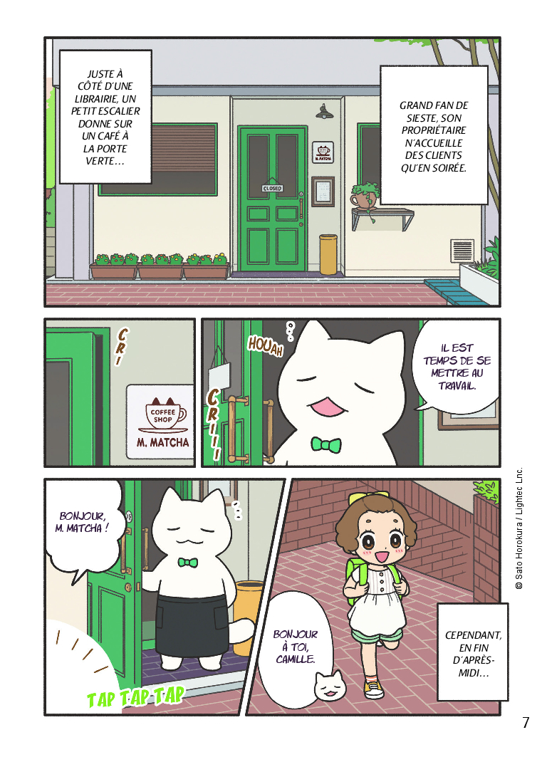 Monsieur Matcha, un gros chat amateur de sieste, n’ouvre son café que le soir. Cependant, à l’heure de la sortie des écoles, il accueille une petite écolière du nom de Camille en attendant que sa mère vienne la récupérer. Et ça tombe bien pour la fillette qui arrive à l’heure du goûter, car son hôte n’est pas qu’un gros dormeur… C’est aussi un cuisinier hors-pair qui adore préparer de petits en-cas. Grâce à Monsieur Matcha et à Camille, découvrez un monde rempli de friandises japonaises et occidentales, souvent revisitées avec brio par le plus gourmand des chats !
