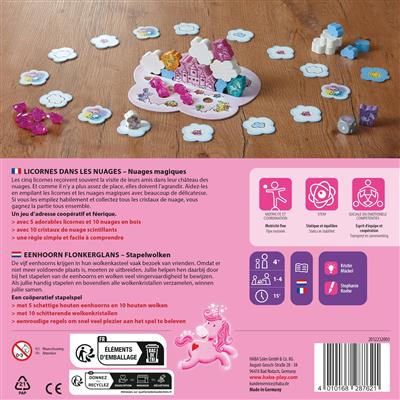 4 licornes : Bonheur étincelant (rose), Poussière d’étoile (jaune), Fleur magique (violet) et Tourbillon magique (turquoise), 1 bébé licorne Rosalie (rose/blanc), 1 château des nuages, 5 nuages magiques blancs et 5 nuages magiques bleus en bois, 1 dé, 1 plateau de jeu « nuage », 16 tuiles « nuage », 10 cristaux de nuage, 1 règle du jeu