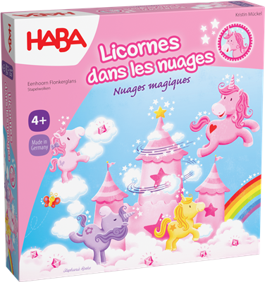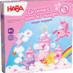 L’objectif est d’agrandir ensemble le château des nuages et de collecter des cristaux de nuage pour pouvoir accueillir toutes les licornes dans leur nouvelle demeure ! Lancez le dé et déplacez Rosalie, le bébé licorne, sur les tuiles Nuage qui entourent le château. Selon le type de nuage où elle atterrit, prenez un gros nuage blanc, un petit nuage bleu ou une licorne et empilez-là sur ou contre le château. Si vous parvenez à empiler tous les éléments, tout le monde gagne la partie ! Attention, si tu fais tomber des éléments, retourne des tuiles ‘nuage’, si un orage apparait pour une troisième fois, tout le monde perd.