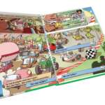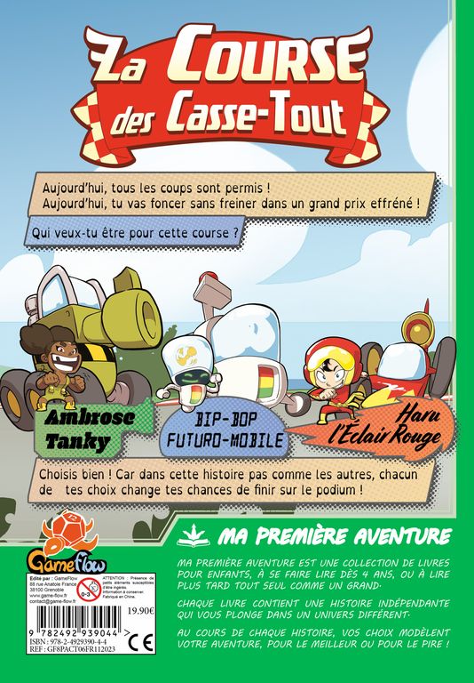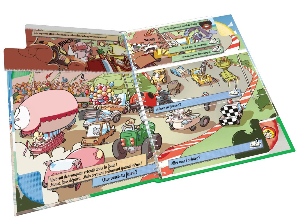 Maintenant, ton aventure peut commencer. Tu vas pouvoir lire ce livre normalement, de gauche à droite, mais rapidement, tu feras face à des choix matérialisés par des pages coupées en trois. Tourne la partie de ton choix et découvre ce qui va se passer. Après plusieurs choix, tu arriveras à la fin de la course… Seras-tu le nouveau champion de la course des Casse-tout ?