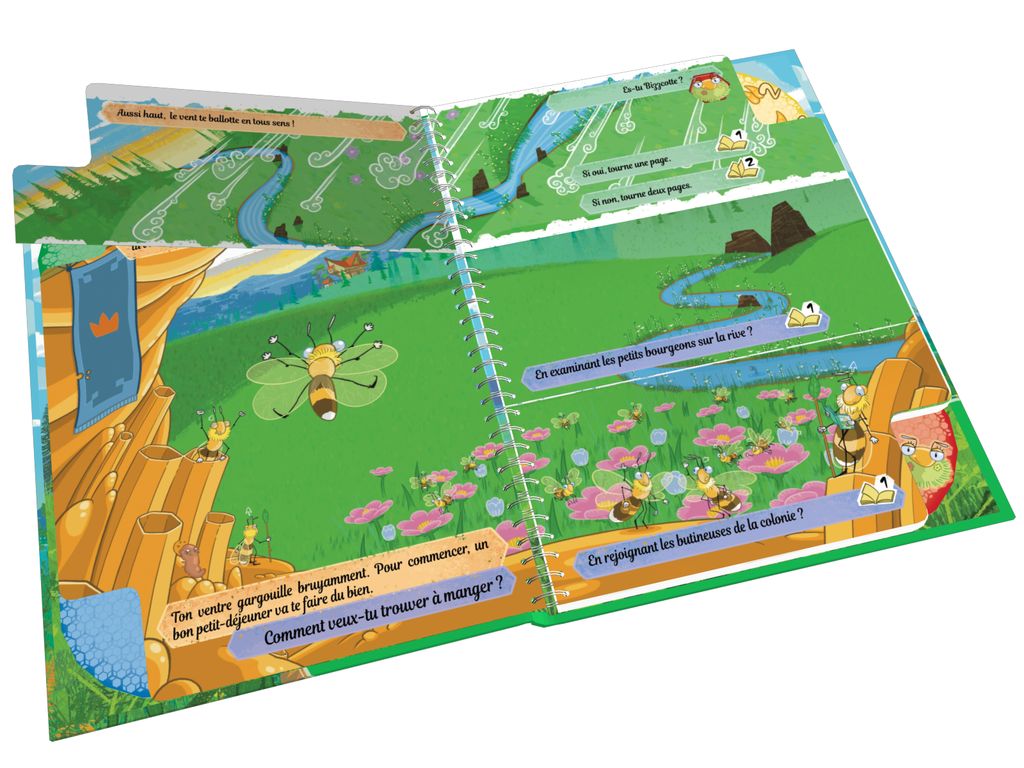Crée ta propre histoire : à chaque page coupée en trois tu devras faire un choix. Ouvre le livre et choisis l’abeille que tu souhaites incarner : Bizzcotte, l’ouvrière puissante et téméraire ? Ou Bizzou, la nourrice fine et pleine de malice ? Maintenant, ton aventure peut commencer.