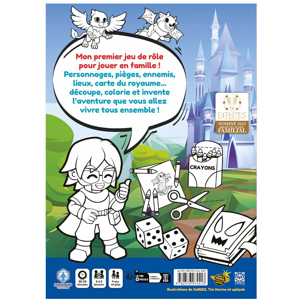 Dans Mon Premier Jeu de Rôle – Une Aventure à Colorier, une personne sera le Narrateur et les autres incarneront des Héros qui partent à l’aventure. Le jeu fonctionne comme une conversation où vous inventez la suite de l’histoire au fur et à mesure, tous ensemble ! Vous pouvez utiliser nos quêtes prédéfinies ou créer les vôtres. Créez vos héros, choisissez leurs capacités et leurs compagnons, créez ensemble la carte de la quête et racontez une histoire étonnante !