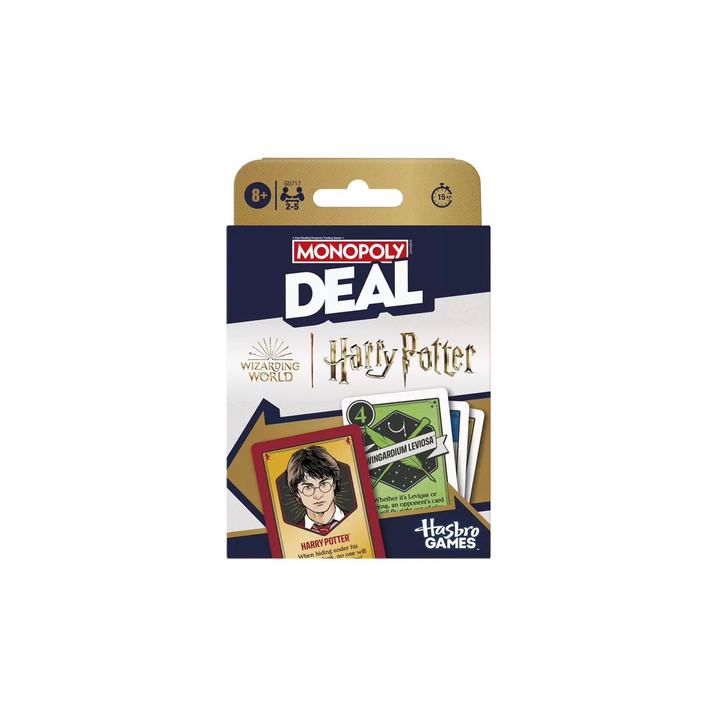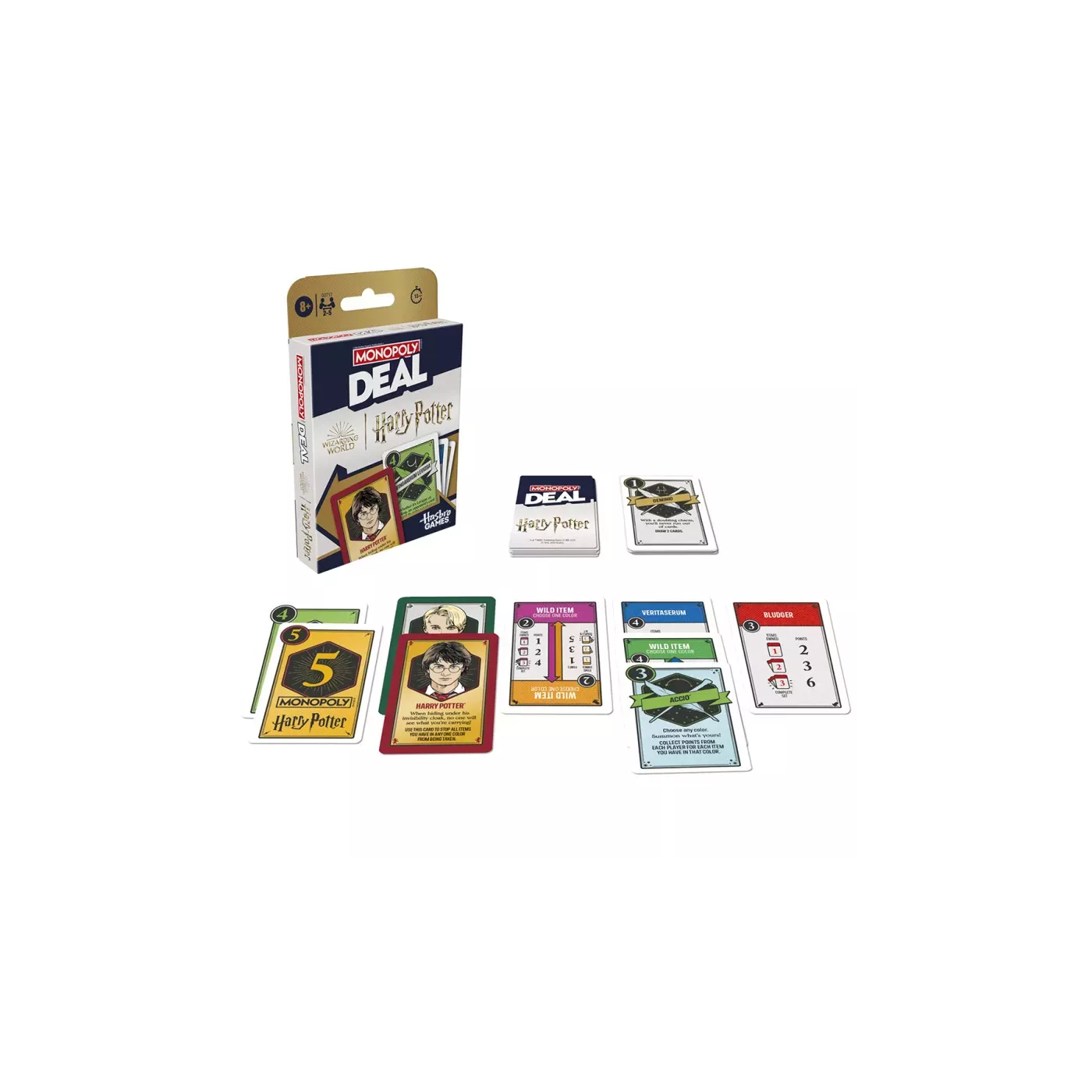 Monopoly Deal est un jeu de cartes rapide et très simple qui reprend le concept du célèbre jeu de société Monopoly, mais cette fois-ci avec vos personnages préférés du monde d’Harry Potter ! Jetez des sorts à vos adversaires et assemblez 3 sets d’objets magiques pour gagner ! Des parties toujours aussi rapides (15 minutes), remplies d’action et de magie !