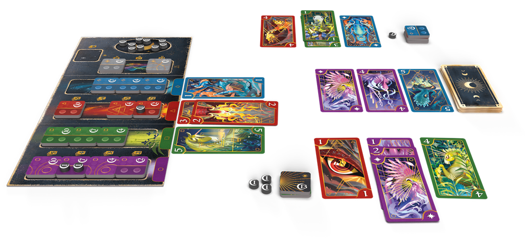 Les Mythicals, ces créatures élémentaires qui se nourrissent de la magie de l’air, de l’eau, de la terre et du feu, ne se révèlent qu’au clair de lune. Vous avez jusqu’à l’aube pour les observer (collecter des cartes) afin de dompter la magie des éléments (gagner des tuiles Maîtrise) et remporter la partie (obtenir le plus de points de victoire).