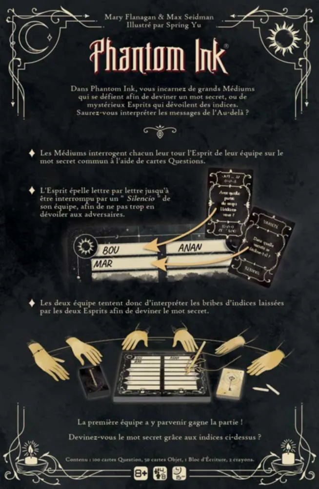 Chacun son tour, le fantôme de l’équipe donne des indices en répondant à une question secrète: il inscrit lettre à lettre sur le Bloc d’écriture le mot avant d’être stoppé par ses médiums le plus tôt possible pour ne pas donner d’indications à l’équipe adverse.