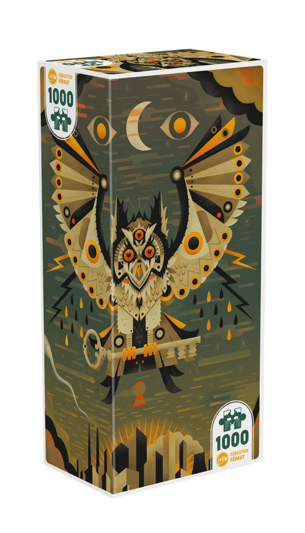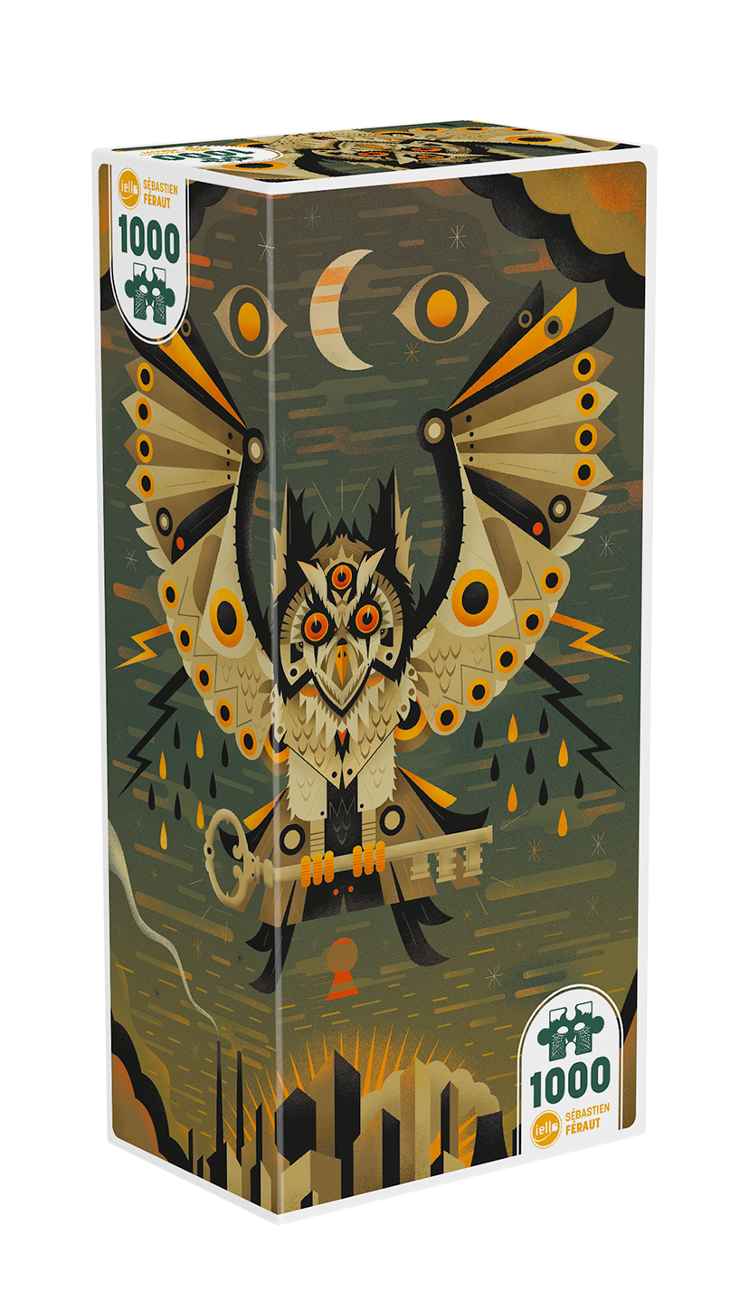 City Owl a été réalisé en 2018 alors que Sébastien Féraut travaillait sur une mini-série d’animaux surréalistes. L’idée de départ consistait à créer un hibou à partir de plusieurs combinaisons de compositions graphiques dans une ambiance colorimétrique plutôt sombre avec des touches lumineuses. L’illustrateur a souhaité intégrer une ville à l’illustration pour trancher avec l’aspect sauvage de l’animal. Le hibou détient les clés de la ville : bien qu’elle ait envahi son territoire, il en reste le maître… tout du moins la nuit.