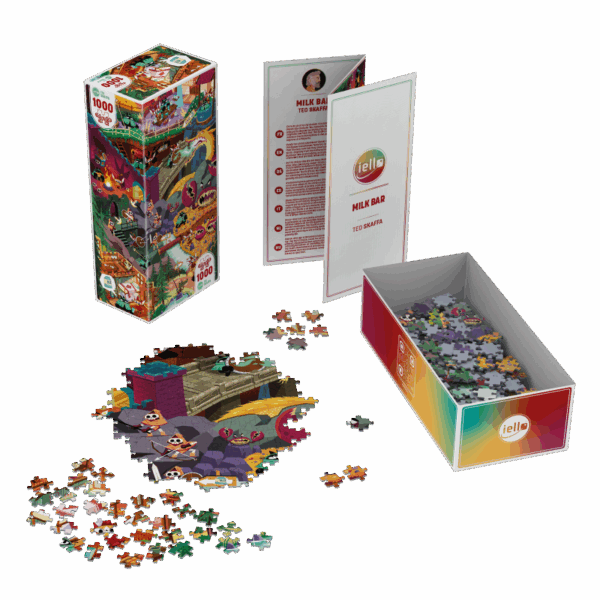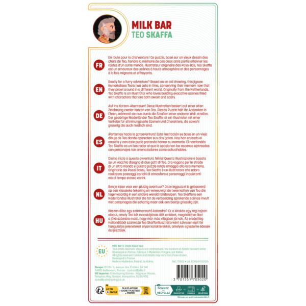 Ce puzzle, basé sur un vieux dessin des chats de Teo, honore la mémoire de ces deux amis partis sillonner les routes d’un autre monde. Illustrateur originaire des Pays-Bas, Teo Skafra est un amoureux des scènes à haute atmosphère et des personnages à la fois mignons et effrayants.