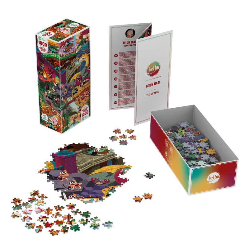 Ce puzzle, basé sur un vieux dessin des chats de Teo, honore la mémoire de ces deux amis partis sillonner les routes d’un autre monde. Illustrateur originaire des Pays-Bas, Teo Skafra est un amoureux des scènes à haute atmosphère et des personnages à la fois mignons et effrayants.