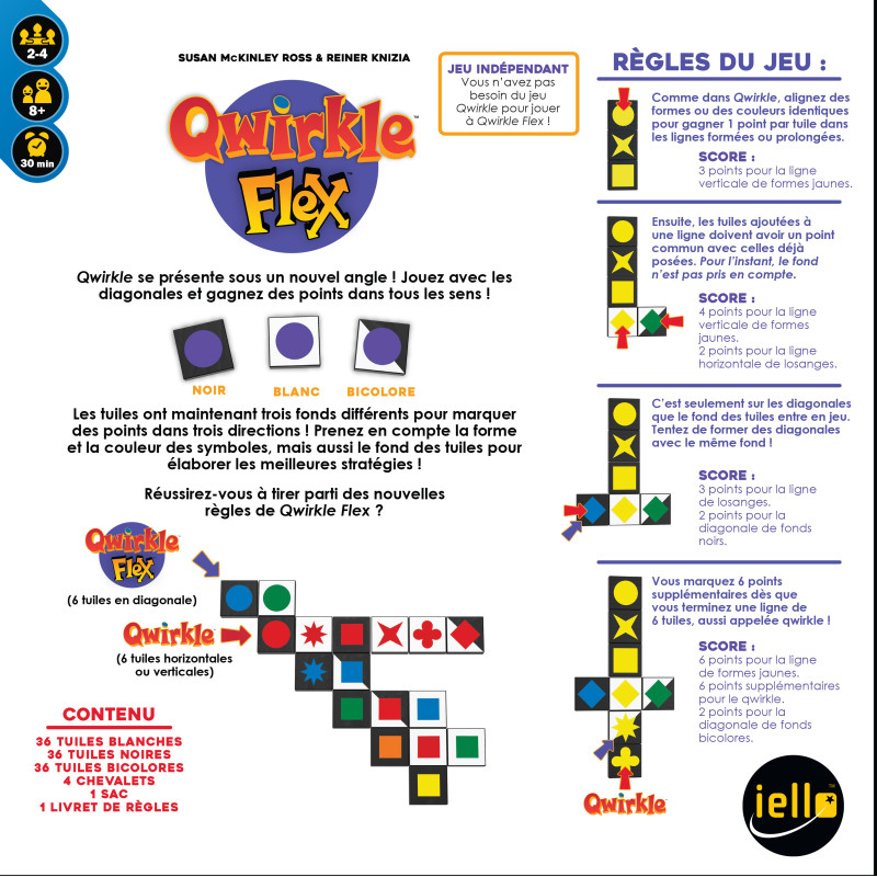 • Comprend 108 tuiles Flex (36 blanches, 36 noires, 36 divisées), 4 supports pour tuiles, un sac à cordon et des instructions complètes