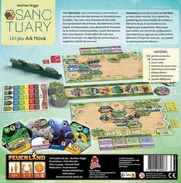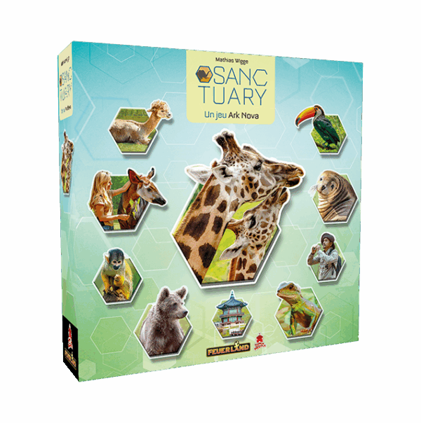 Pour cela, vous disposez de 135 tuiles Zoo représentant des animaux, des bâtiments et des projets. À chaque partie, vous devez placer vos tuiles de la meilleure manière possible, à partir des options dont vous disposez. Divers effets de tuile vous aident à accomplir vos objectifs de conservation et augmenter l’attrait de votre zoo. Sanctuary est une déclinaison de Ark Nova, un best-seller mondial. Il en reprend les grandes lignes mais simplifie de nombreux éléments de jeu d’une manière aussi élégante que surprenante.