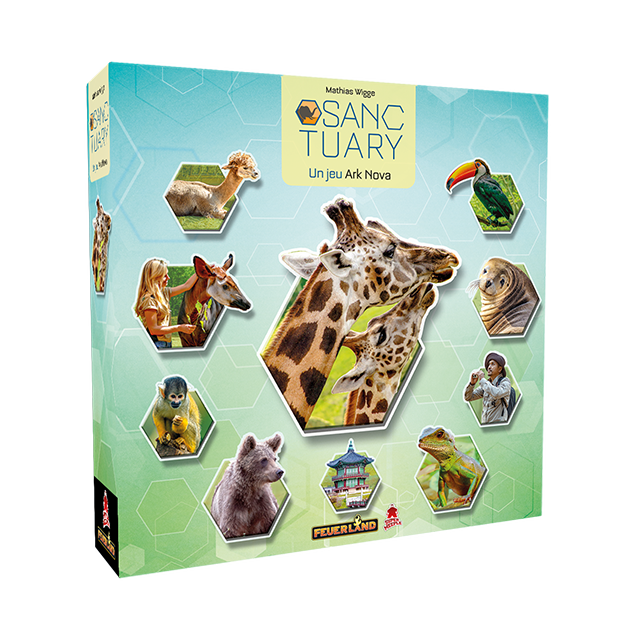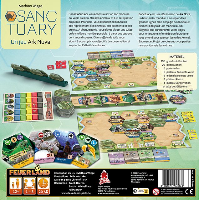 Pour cela, vous disposez de 135 tuiles Zoo représentant des animaux, des bâtiments et des projets. À chaque partie, vous devez placer vos tuiles de la meilleure manière possible, à partir des options dont vous disposez. Divers effets de tuile vous aident à accomplir vos objectifs de conservation et augmenter l’attrait de votre zoo. Sanctuary est une déclinaison de Ark Nova, un best-seller mondial. Il en reprend les grandes lignes mais simplifie de nombreux éléments de jeu d’une manière aussi élégante que surprenante.