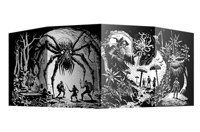 L’écran est un 4 volet format A5 portrait contenant une grande illustration en noir et blanc d’un côté et tous les tableaux nécessaires de l’autre pour mener la partie de manière encore plus fluide.
