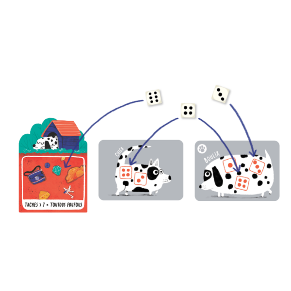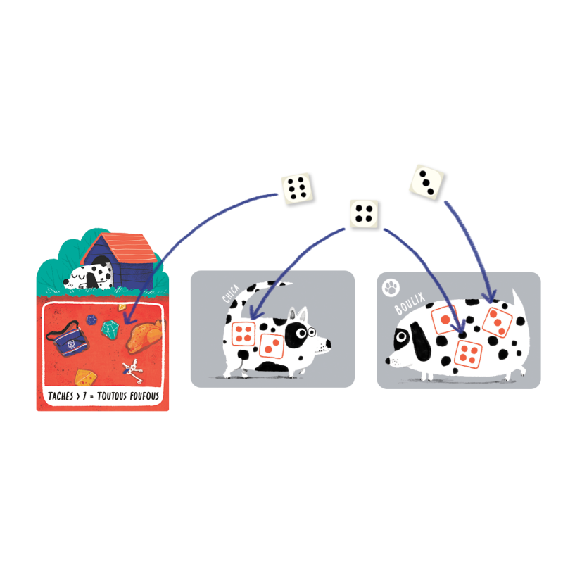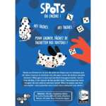 Dans « Spots ou Encore », chaque joueur reçoit des cartes Toutou qu’il doit compléter en plaçant des dés sur les spots correspondants. Les cartes sont dotées de motifs de taches, et le but est de recouvrir ces taches avec les dés appropriés. Chaque tour, vous choisissez une tuile Tour et suivez les actions indiquées, qui peuvent impliquer de lancer des dés, de les placer sur vos toutous, ou de les enterrer sous votre niche si vous ne pouvez pas les utiliser. Le jeu est à la fois simple à comprendre et suffisamment stratégique pour maintenir l’intérêt des joueurs au fil des parties. Maîtrisez les tours, gérez vos dés, et évitez que vos toutous ne deviennent foufous !