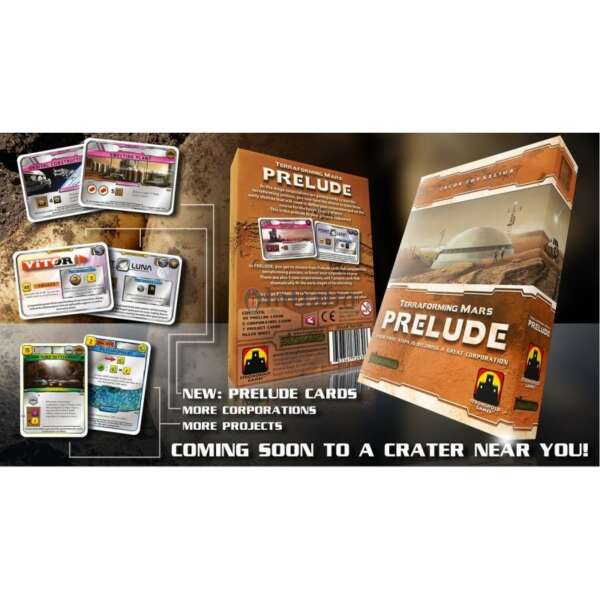 Dans PRELUDE, vous pouvez choisir parmi les cartes Prelude qui déclenchent le processus de terraforming, ou booster les mécanismes de votre société. Cette extension contient 5 nouvelles mégacorporations et 7 cartes de projet qui correspondent thématiquement aux premières étapes de la terraformation.