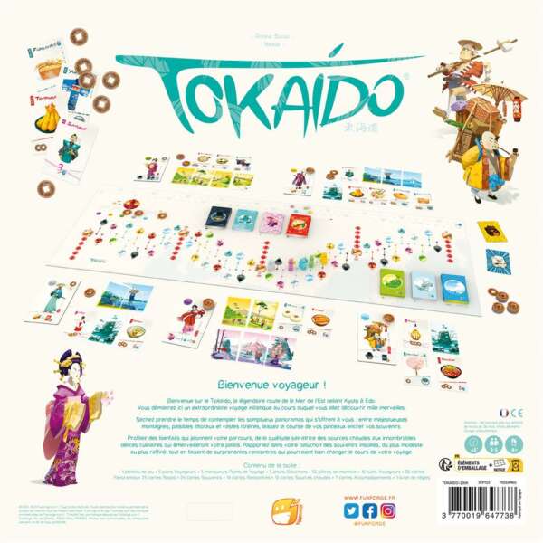Tokaido est un jeu de parcours et de collection pour 2 à 5 joueurs. Les joueurs sont des voyageurs du Japon d’autrefois arpentant la route de la Mer de l’Est. Ils sont amenés à contempler de magnifiques paysages, à déguster de délicieuses spécialités culinaires, à acquérir des souvenirs, à faire des rencontres, etc.