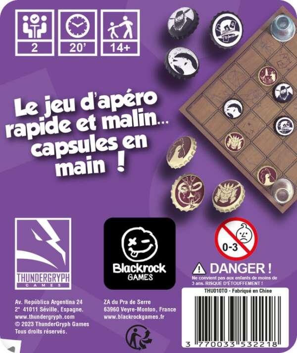 Vous ne pouvez pas quitter le plateau, sauter ou atterrir sur une capsule, ni atterrir sur votre bouteille. Si vous déplacez l’un de vos bouchons sur la bouteille de votre adversaire, vous gagnez. Si vous ne pouvez pas déplacer légalement l’un de vos bouchons pendant votre tour, vous perdez.