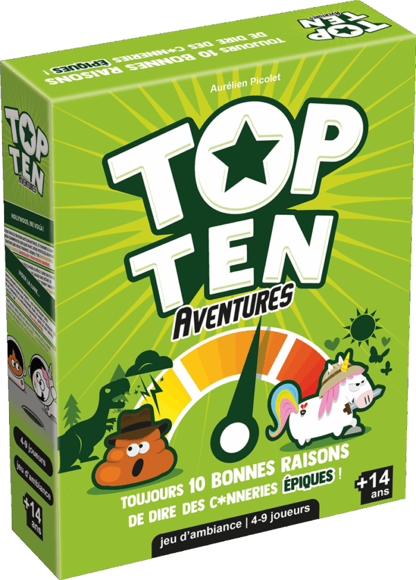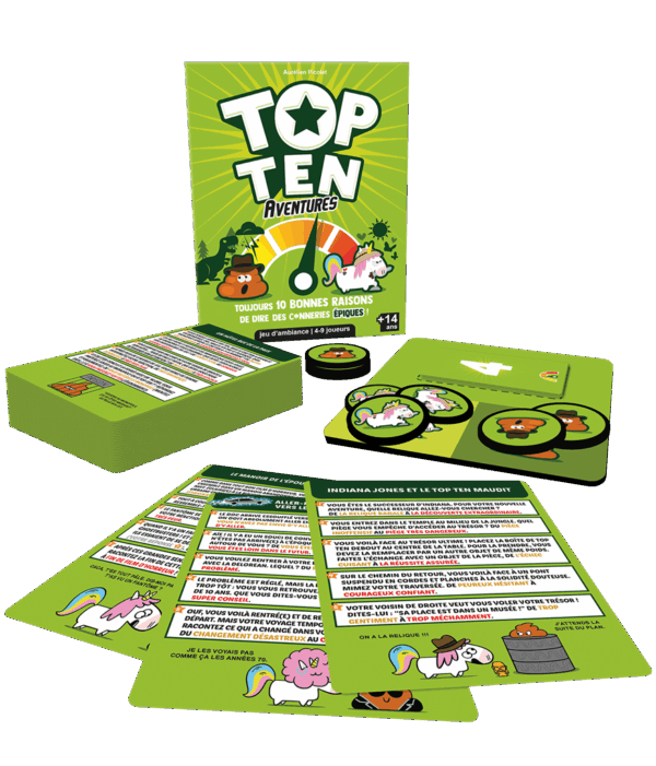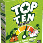 Dans ce jeu d’ambiance coopératif, une aventure sera choisie à chaque partie et les joueurs devront répondre aux 5 questions successives du thème, en inventant leur réponse selon un numéro secret de 1 à 10 selon une échelle qu’eux seuls connaissent. Si le Cap’ten arrive à classer les réponses dans le bon ordre, l’équipe a gagné ! Un jeu d’ambiance et d’humour idéal pour un apéro entre amis ou pour des moments de complicité en famille. Top Ten Aventures propose de nombreuses et diverses aventures pour tous les goûts : ainsi, les fans de science-fiction, les amateurs de film d’action ou encore les amoureux du quotidien y trouveront leur bonheur… Beaucoup sont d’ailleurs inspirés d’oeuvres culturelles : à vous de réinventer l’histoire à votre sauce.