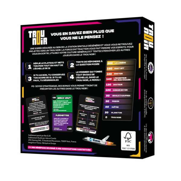 Le jeu s’arrête lorsqu’un joueur atteint la case du Trou noir. Le joueur le plus haut placé sur la plateau gagne !