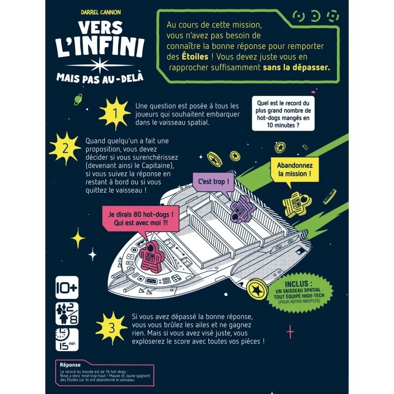 A tout moment, les joueurs les plus sceptiques peuvent finalement décider de descendre du vaisseau s’ils pensent que la réponse correcte est dépassée. Puis on regarde la bonne réponse et les joueurs récoltent ou non des points Étoiles en fonctions des enchères qui ont été faites. Le joueur qui a le plus de points au bout de 8 cartes Questions remporte la victoire !