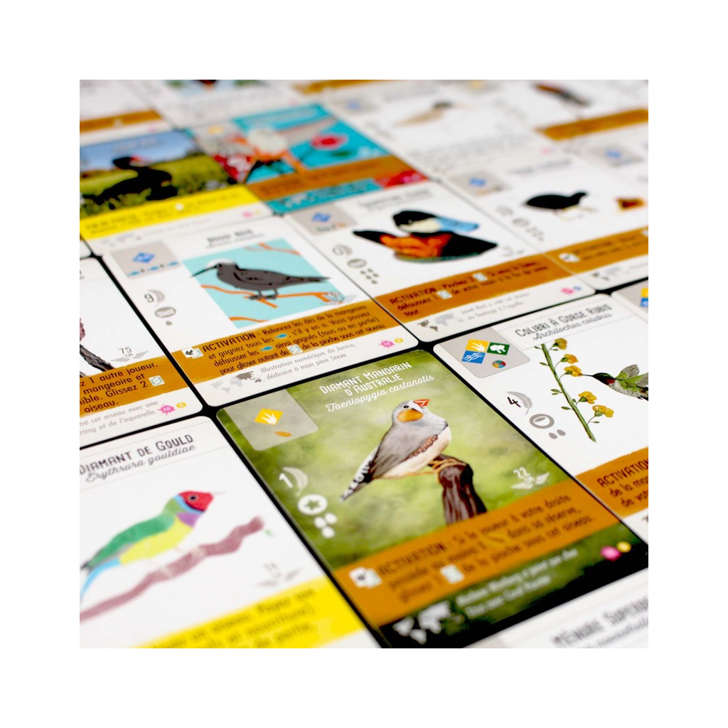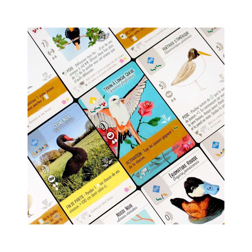 Plus de 300 fans de Wingspan ont soumis des illustrations de leurs oiseaux préférés du jeu pour le Wingspan Fan Art Challenge, et nous en avons sélectionné 255. Le résultat final est un paquet de cartes oiseaux – mécaniquement identiques à leurs homologues du jeu Wingspan et des extensions Europe, Océanie et Asie – mais qui ajoutent une saveur particulière aux plateaux de jeu.